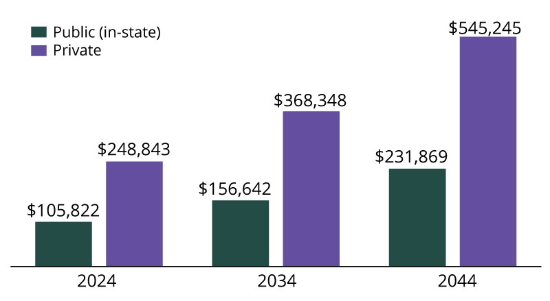 Source: The College Board, “Trends in College Pricing and Student Aid,” 2024. Based on average total charges for tuition, plus room and board for one year (2024-2025) amounting to $24,920 at a public, in-state, four-year college, and $58,600 at a private, four-year college. For illustrative purposes only. Assumes 4% annual increases. Future college expenses may be higher or lower than the amounts shown.