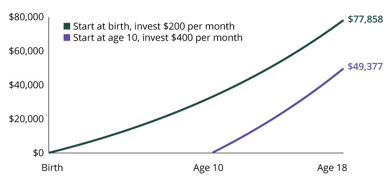For example, investing $200 per month from the time a child is born until the day they turn 18 could grow to nearly $78,000, assuming a 6% rate of return. By contrast, investing $400 a month from ages 10 to 18 would have only amassed about $49,000 (also assuming a 6% rate of return). Investment returns are not guaranteed, and you could lose money by investing in a 529 plan.