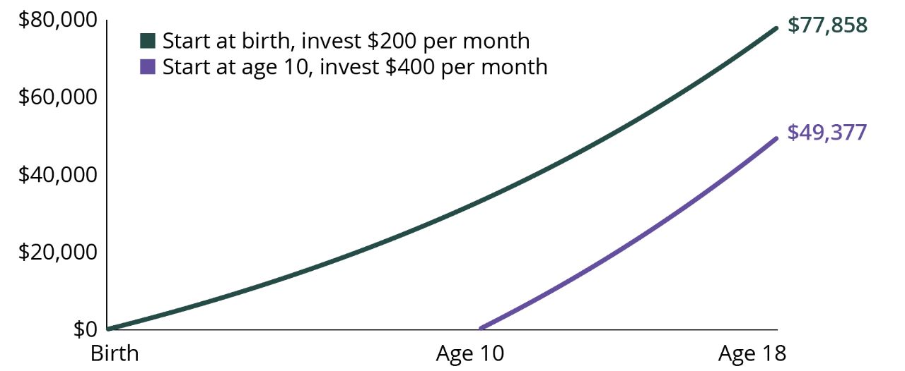 For example, investing $200 per month from the time a child is born until the day they turn 18 could grow to nearly $78,000, assuming a 6% rate of return. By contrast, investing $400 a month from ages 10 to 18 would have only amassed about $49,000 (also assuming a 6% rate of return). Investment returns are not guaranteed, and you could lose money by investing in a 529 plan.